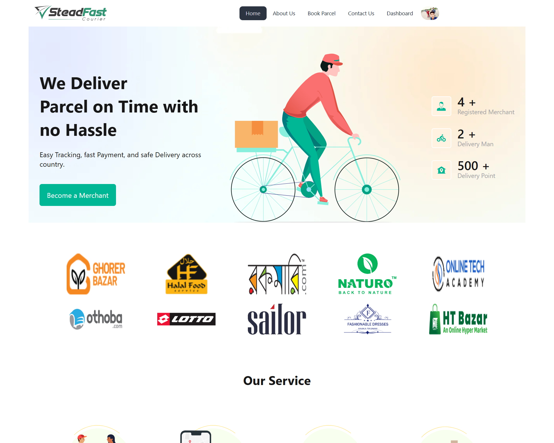 Here is a nice design with three main pages: About Us, Book Parcel, and Contact Us. There are also Login and Registration pages, and a dashboard system with three different roles: User Dashboard (with two pages: My Profile and My Booked Parcels) Admin Dashboard (with the following sections: All Users, All Delivery Men, All Orders, and All Messages) Delivery Man Dashboard (with two pages: My Delivery List and My Feedback) All the functionalities are working properly.